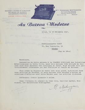 Brief der Bürowarenhandlung Au Bureau Moderne/Rosemonde Montaggioni, Arles-sur-Rhône adressiert an Etablissements Sirot, Thiers; datiert 30.12.1947 Maschinenschrift, unterschrieben
