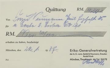 Quittung der Schreibmaschinenhandlung Rudolf Kroh, München ausgestellt auf Frau Neumann, München; datiert 22.01.1937 Handschrift