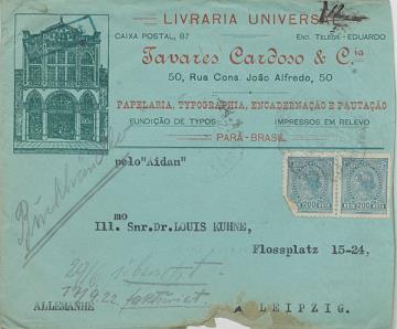 Briefumschlag, Brief und Auftragsbestätigung der Bürowarenhandlung Tavares Cardoso & Coa, Pará adressiert an Snr. Kuhne, Leipzig; datiert 03.06.1922 Maschinenschrift, Handschrift, unterschrieben Briefmarken Brasil Correio 200 Reis+200 Reis; Poststempel unleserlich