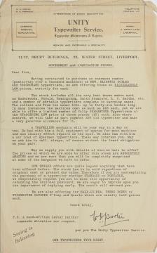 Rundschreiben der Schreibmaschinenhandlung Unity Typewriter Service, Liverpool Maschinenschrift, Unterschriftstempel