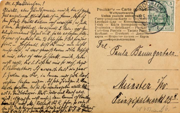 Illustrierte Postkarte; Fotografie, monochrom; Serie 2041/1 Rückseite: Frau mit Schreibmaschine, Blick zum Betrachter Vorderseite: beschrieben, adressiert an Frl. Baumgartner, Münster; Briefmarke Deutsches Reich 5 Pf., Poststempel Bochum/-6.5.1910