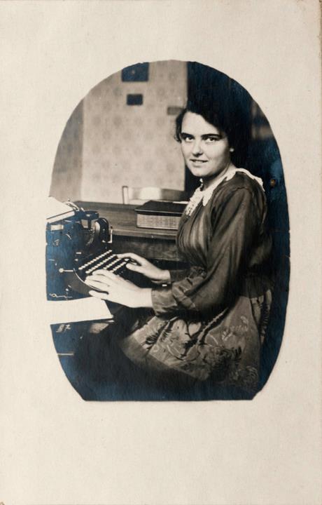 Illustrierte Postkarte; Fotografie, monochrom Rückseite: Sekretärin mit Schreibmaschine in einem Büro Vorderseite nicht beschrieben