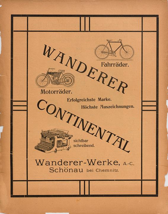 Werbeanzeige für Fahr- und Motorräder Wanderer und Schreibmaschine Continental monochrom, zwei Exemplare