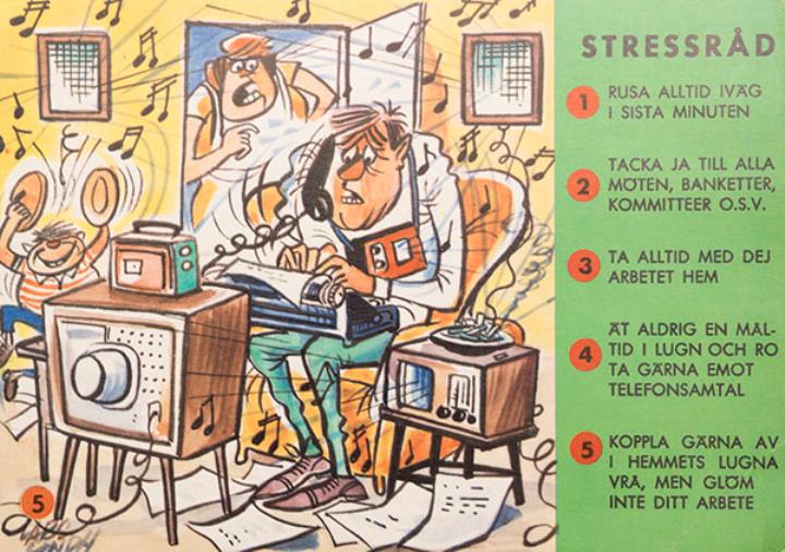 Illustrierte Postkarte; Grafik, polychrom; Nr. 910 Rückseite: Stressratschlag 5; Mann mit Schreibmaschine, umgeben von technischen Geräten und Lärm Vorderseite nicht beschrieben
