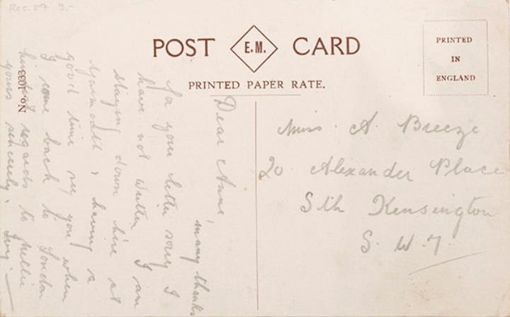 Illustrierte Postkarte; Grafik, polychrom; Rückseite: Sekretärin mit Schreibmaschine (Rundbild) und beim Spazieren entlang der Strandpromenade Vorderseite beschrieben und adressiert