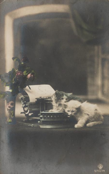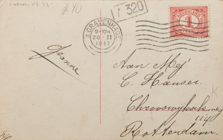 Illustrierte Postkarte; Fotografie, koloriert; Serie RPH 5713/14 Rückseite: zwei Katzen mit Schreibmaschine, Blumen als Dekoration Vorderseite: beschrieben; adressiert an Mej Hauser, Rotterdam; Briefmarke Nederland 1 Cent; Poststempel 's Gravenhage/20 II 1917