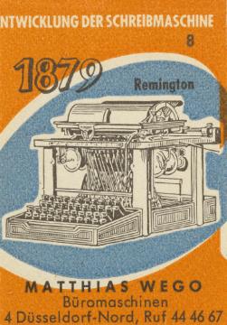 Reklamemarke/Werbemarke einer Serie (Matthias Wego Büromaschinen); rechteckig, polychrom 1879. Remington
