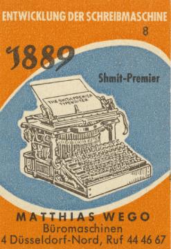 Reklamemarke/Werbemarke einer Serie (Matthias Wego Büromaschinen); rechteckig, polychrom 1889. Smith-Premier