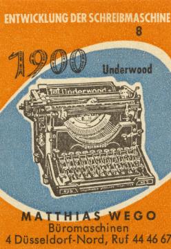 Reklamemarke/Werbemarke einer Serie (Matthias Wego Büromaschinen); rechteckig, polychrom 1900. Underwood