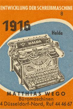 Reklamemarke/Werbemarke einer Serie (Matthias Wego Büromaschinen); rechteckig, polychrom 1916. Halda