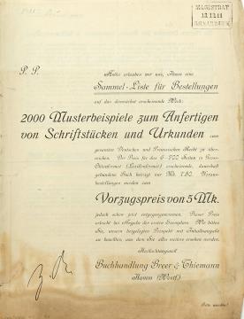 Prospekt mit Antwortkarte der Buchhandlung Breer & Thiemann, Hamm mit Datumstempel versehen