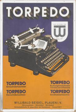 Werbeschild aus Pappkarton für Schreibmaschine Torpedo polychrom mit Schlitzen zur Anbringung eines Abreißkalenders