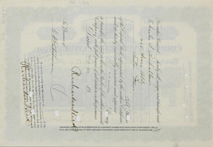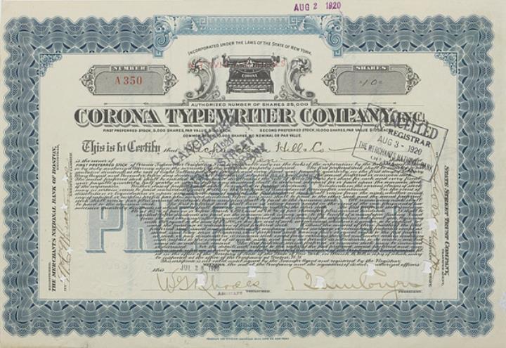 Aktie Nr. A350 der Corona Typewriter Company, Inc. über 10 Anteile ausgestellt auf Richardson, Hill & Co.; datiert 28.08.1920 Druck: Franklin Lee Division - American Bank Note Co.