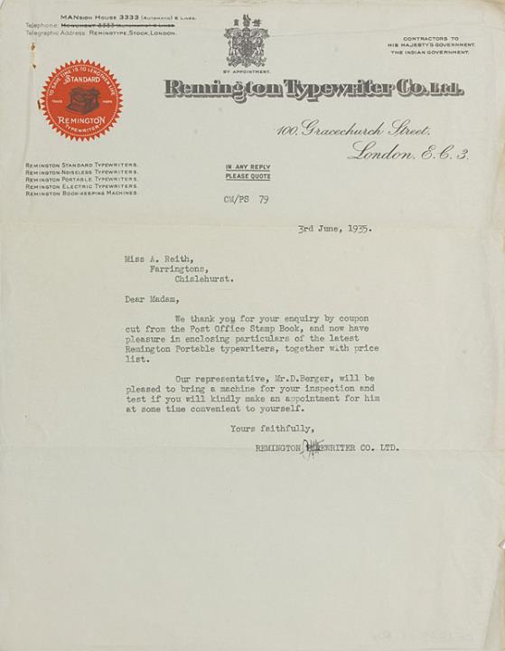 Brief mit Preisliste der Remington Typewriter Co., London adressiert an Miss Reith, Chislehurst; datiert 03.06.1935 Maschinenschrift, unterschrieben