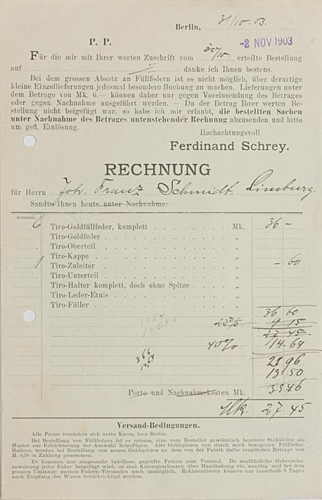 Rechnung der Schreibmaschinenhandlung Ferdinand Schrey, Berlin adressiert an Herrn Schmidt, Limburg; datiert 02.11.1903 Handschrift