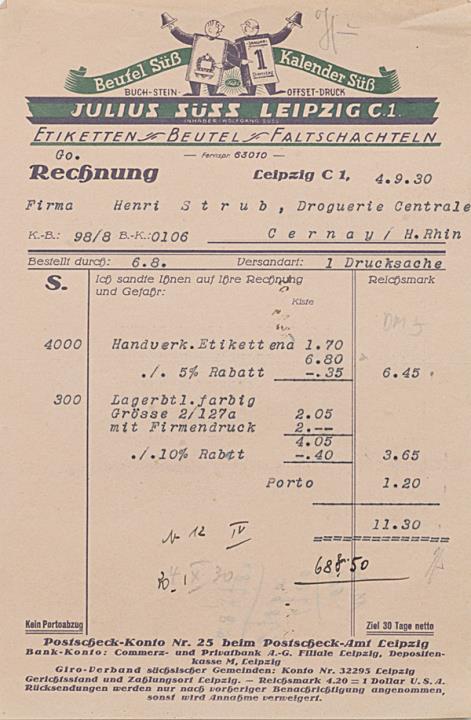 Rechnung der Druckerei Julius Süss, Leipzig adressiert an Firma Strub, Cernay; datiert 04.09.1930 Maschinenschrift