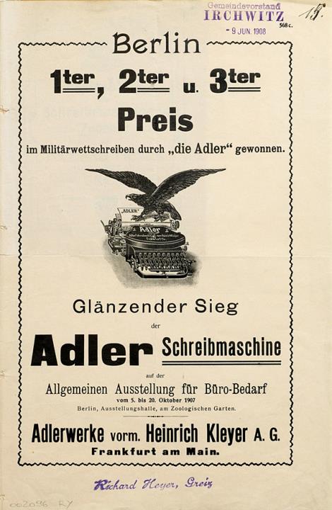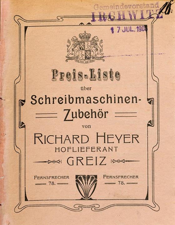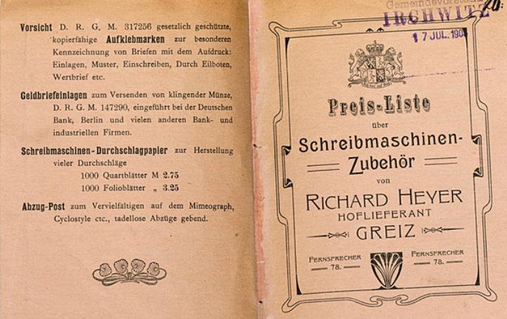 Prospekt für Schreibmaschine Adler und Zubehör der Schreibmaschinenhandlung Richard Heyer, Greiz Nr. 568c; mit Datumstempel versehen