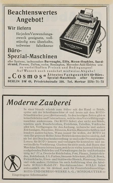 Werbeanzeige der Büromaschinenhandlung Cosmos, Berlin und Vervielfältigungsmaschine Roto; auf Papier geklebt monochrom