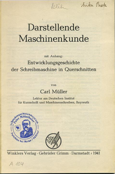 Darstellende Maschinenkunde und Entwicklungsgeschichte der Schreibmaschine in Querschnitten