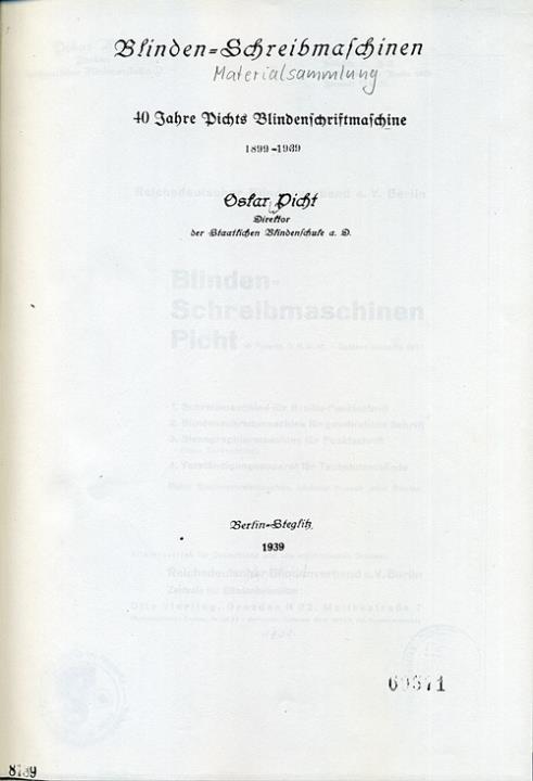 Blinden-Schreibmaschinen: 40 Jahre Pichts Blindenschriftmaschine (1899-1939) / Materialsammlung