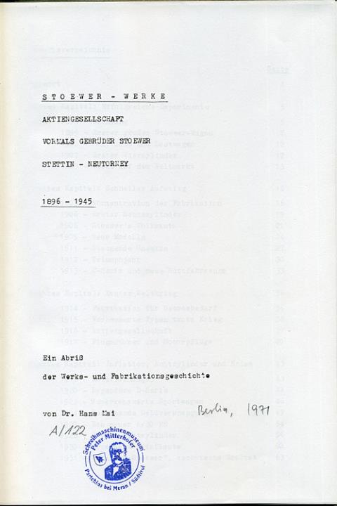 Stoewer-Werke Aktiengesellschaft vormals Gebrüder Stoewer, Stettin-Neutorney 1896-1945. Ein Abriß der Werks- und Fabrikationsgeschichte