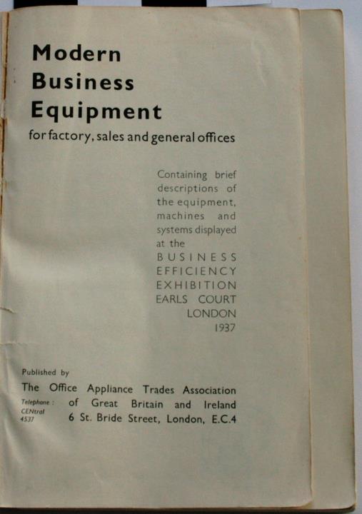 Containing brief descritions of the equipment [...] displayes at the Business Efficiency Exhibition Earls Cour London 1937