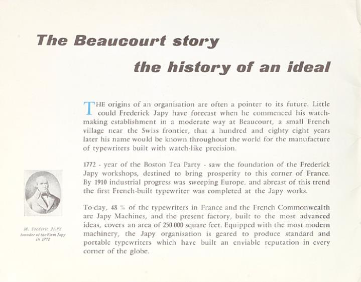 Prospekt zu Firmengeschichte und Schreibmaschinen Japy, Beaucourt Nr. 60.3.02