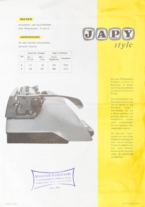 Prospekt für Schreibmaschine Japy Style Alle neuesten technischen Errungenschaften in einer Maschine vereint Nr. 6325