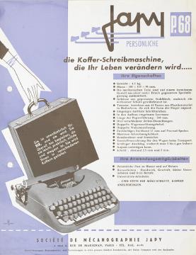 Prospekt für Schreibmaschine Japy P68 die Koffer-Schreibmaschine, die Ihr Leben verändern wird...