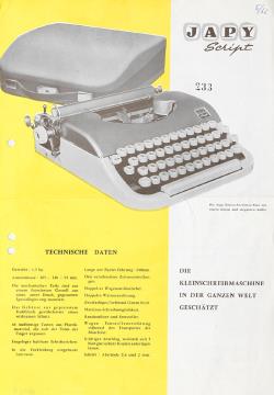 Prospekt für Schreibmaschine Japy Script Die Kleinschreibmaschine in der ganzen Welt geschätzt Datum handschriftlich vermerkt