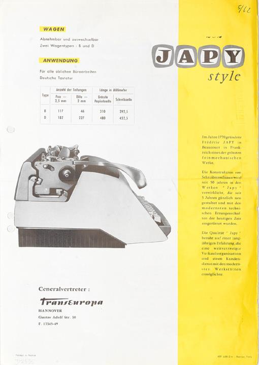 Prospekt für Schreibmaschine Japy Style Alle neuesten technischen Errungenschaften in einer Maschine vereint Datum handschriftlich vermerkt
