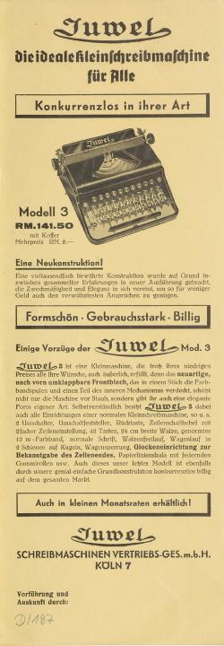 Prospekt für Schreibmaschine Juwel Mod. 3 Konkurrenzlos in ihrer Art