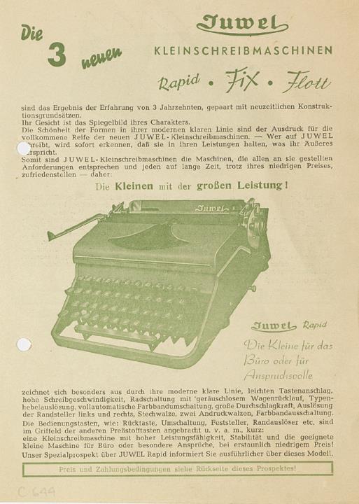 Faltprospekt für Schreibmaschine Juwel Rapid, Fix, Flott, zwei Exemplare (eines fotokopiert/gebunden)