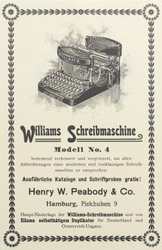 Werbeanzeige für Schreibmaschine Williams 4; auf Karton geklebt monochrom