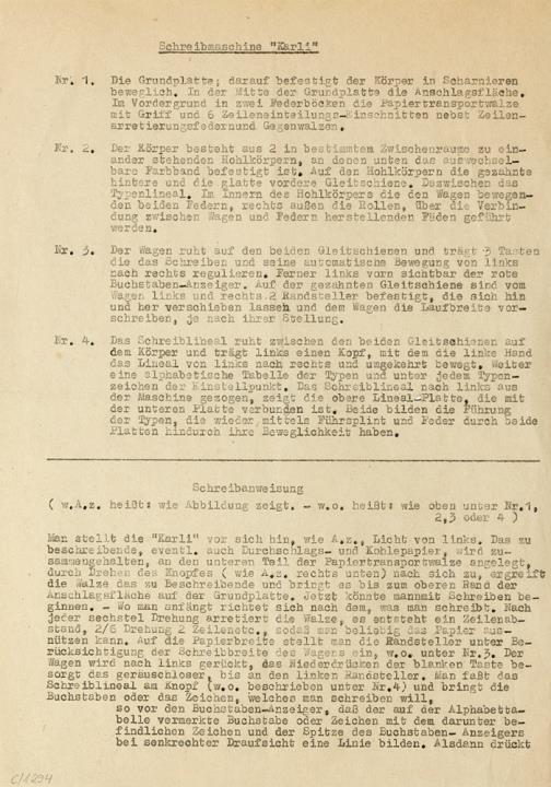 Bedienungsanleitung (in Maschinenschrift) für Schreibmaschine Karli