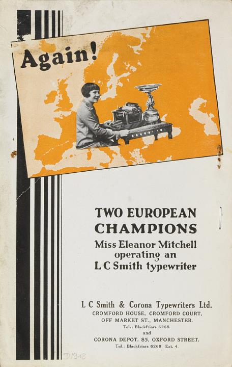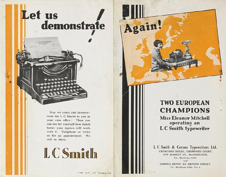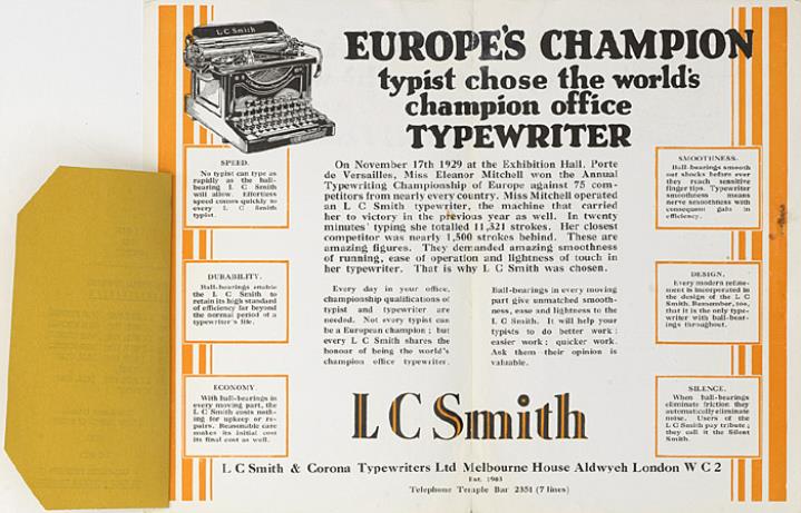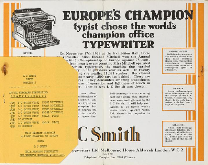 Faltprospekt für Schreibmaschine L. C. Smith 8/10 mit Ergebnissen der Europäischen Meisterschaft im Maschinenschreiben Two European Champions. Miss Eleanor Mitchell operating an L C Smith typewriter Nr. S408 25 M I-31