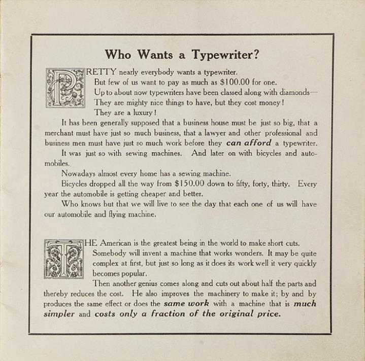 Next to literature on the history of technology, of the typewriter and the office, the Archive holds patent letters, textbooks and instruction manuals as well as historical postcards, letters, photographs and various kinds of advertising (leaflets and brochures, advertising stamps, newspaper ads, posters and signs, promotional gifts).