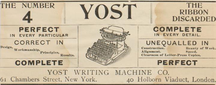 Werbeanzeige für Schreibmaschine Yost 4 monochrom