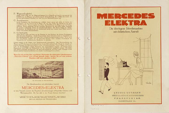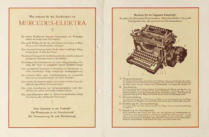 Faltprospekt für Schreibmaschine Mercedes Elektra Die überlegene Schreibmaschine mit elektrischem Antrieb Nr. W.1028-50-5/27-MG-2