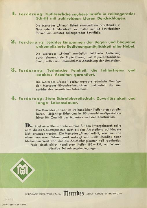 Prospekt für Schreibmaschine Mercedes Prima Was Sie von einer guten Schreibmaschine verlangen müsseNr...erfüllt die Mercedes Prima Nr. W1479-250-1.35.-Sabo