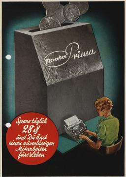 Faltprospekt für Schreibmaschine Mercedes Prima, Superba und Selecta Schon für RM 9.60 Anzahlung eine gute Schreibmaschine ins Haus! Nr. W.100.6.38.O.E.