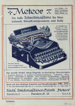 Prospekt für Schreibmaschine Meteor Die beste Schreibmaschine für Büro jedwede Privatkorrespondenz und Reise Datum handschriftlich vermerkt