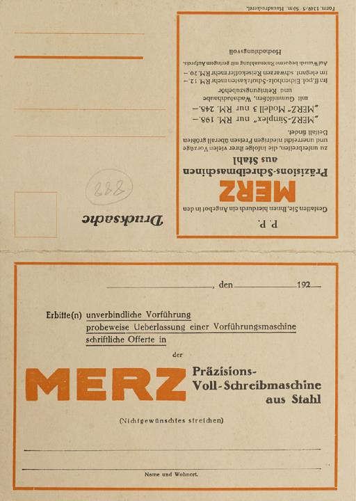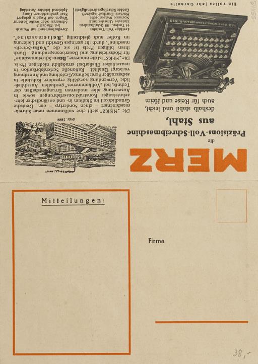 doppelteilig zusammengeklappte Reklame/Anwortkarte für Schreibmaschine Merz Nr. 1249/5 50m