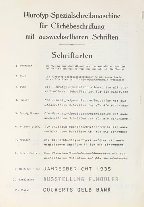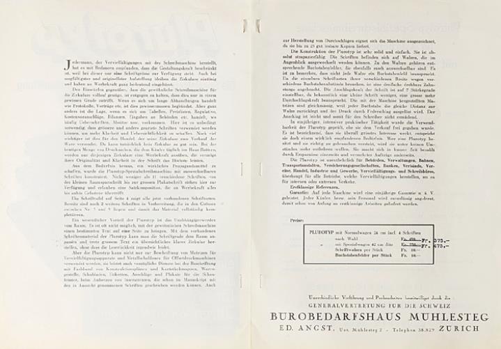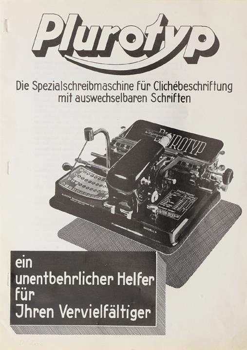 Faltprospekt für Schreibmaschine Olympia Plurotyp Die Spezialschreibmaschine für Clichébeschriftung mit auswechselbaren Schriften