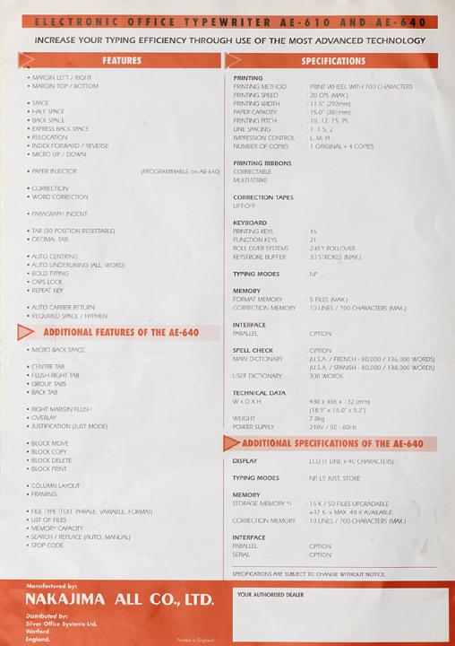 Prospekt für elektronische Schreibmaschine Nakajima AE-610 und AE-640
