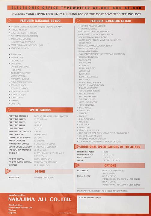 Prospekt für elektronische Schreibmaschine Nakajima AE-800 und AE-830