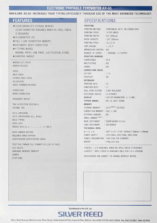 Prospekt für elektronische Schreibmaschine Nakajima AX-65