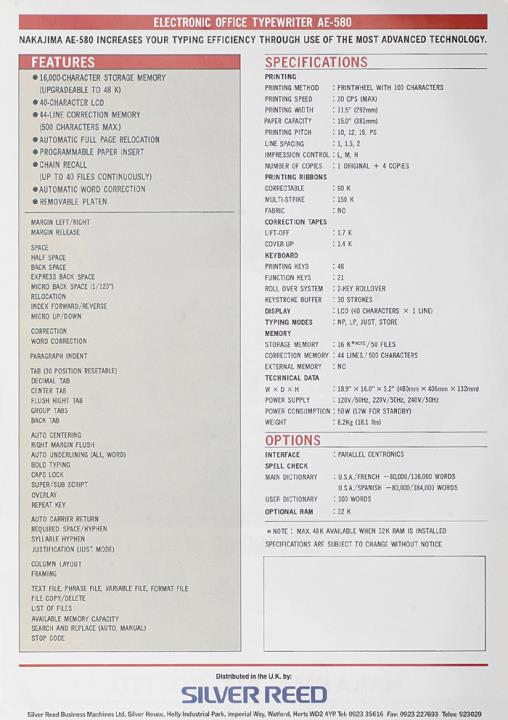 Prospekt für elektronische Schreibmaschine Nakajima AE-580