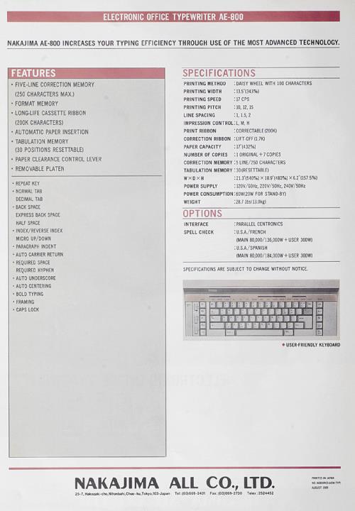 Prospekt für elektronische Schreibmaschine Nakajima AE-800