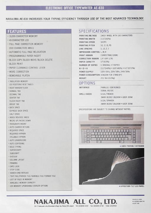 Prospekt für elektronische Schreibmaschine Nakajima AE-830